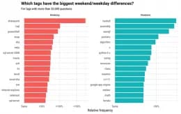 For me, the weekends are mostly about spending time with my family, reading for leisure, and working on the open-source projects I am involved in. These weekend projects overlap with the work that I do in my day job here at Stack Overflow, but are not exactly the same. Many developers tinker with side projects for learning or career development (or just for fun!) and at Stack Overflow, we support all types of technologies, from professional to hobbyist. Whenever people are working, we’re available to answer their questions. But what languages tend to be asked about on weekends, as opposed to weekdays?